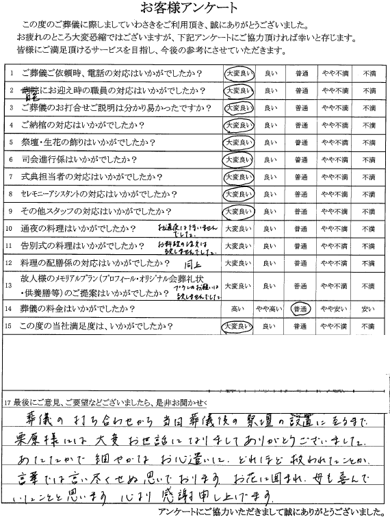 葬儀の打合せから当日葬儀後の祭壇の設置に至るまで栗原様には大変お世話になりまして、ありがとうございました。あたたかで細やかな心遣いにどれほど救われたことか。言葉では言い尽くせぬ思いでおります。お花に囲まれ母も喜んでいることと思います。心より感謝申し上げます。
