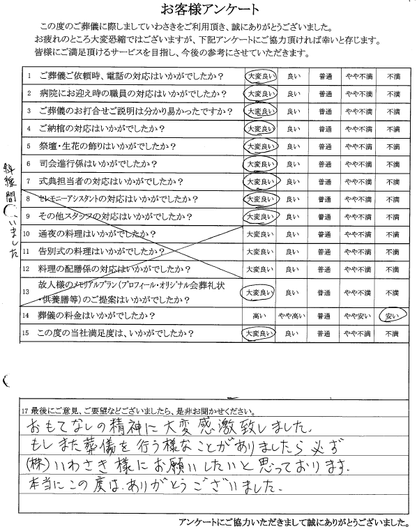 2025-11-21 / 最終更新日時 : 2025-11-21 編集担当者 シティホール狭山 おもてなしの精神に感激しました 狭山市在住 Y.I様 おもてなしの精神に大変感激致しました。もしまた葬儀を行う様な事がありましたら必ず、㈱いわさき様にお願いしたいと思っております。本当にこの度はありがとうございました。 【 アンケート用紙を見る 】