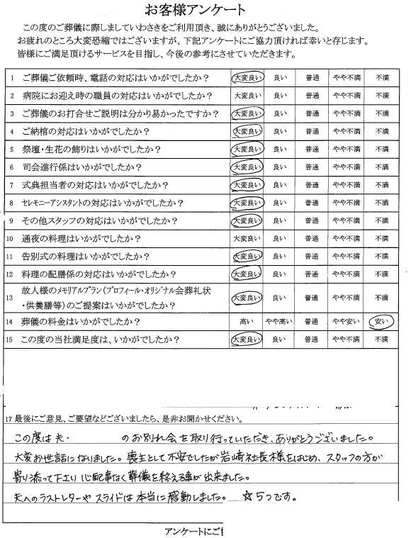 この度は夫のお別れ会をとり行っていただき、ありがとうございました。大変お世話になりました。喪主として不安でしたが、岩﨑社長をはじめ、スタッフの方が寄り添って下さり、心配事なく終える事ができました。夫へのラストレターやスライドは本当に感動しました。☆5つです。