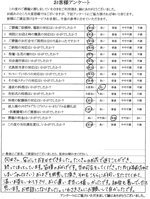 向井さん、安心してお任せできました。たくさんのお花で送る事ができ、終わってホッとしています。皆様のおかげです。当日司会をして下さった方、おはぎを用意して頂き、それもこちらにお伺いをたててくれて、温かいお茶をいれてくださり、お心遣い本当にうれしかったです。祖母も喜んでいたと思います。お世話になりました。いわさきさんにお願いしてよかったです。