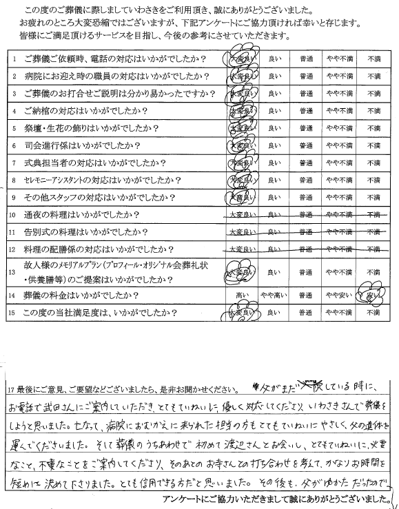 父がまだ入院している時にお電話で武田さんにご案内して頂き、とても丁寧に優しく対応して下さり、いわさきさんで葬儀をしようと思いました。亡くなって病院にお迎えに来られて方担当の方も丁寧に優しく父の遺体を運んでくださいました。そして葬儀の打合せで始めて渡辺さんとお会いし、とても丁寧に必要な事、不要な事をご案内してくださり、その後のお寺さんとの打合せを考えてかなりお時間を短めに決めて下さりました。とても信用のできる方だと思いました。